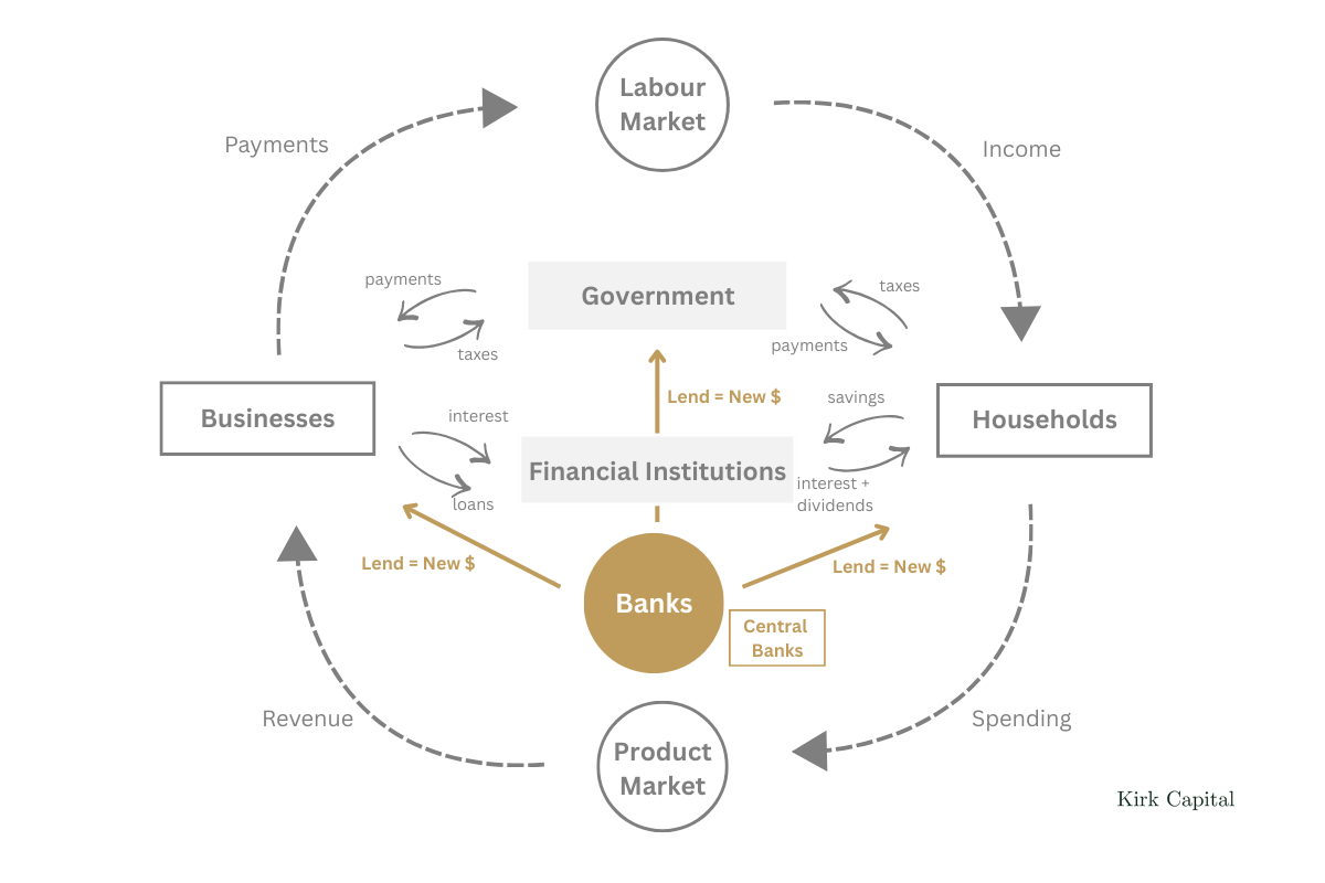 In reality, banks create money when they lend, credit (lent money) drives asset prices, and liquidity moves financial markets.